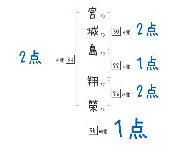 天運![]() | 宮城島翔榮さんの天運は30画の2つ星!浮き沈みの激しさに注意しましょう。 家系が持つ宿命的な運勢を表します。祖先から受け継いだ苗字ですので自分の力が及びません。家柄を象徴します。 |