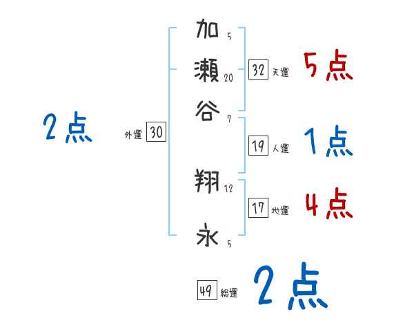 天運![]() | 加瀬谷翔永さんの天運は32画の5つ星!柔軟性があり成功する。チャンスが多く金運が良い。 家系が持つ宿命的な運勢を表します。祖先から受け継いだ苗字ですので自分の力が及びません。家柄を象徴します。 |