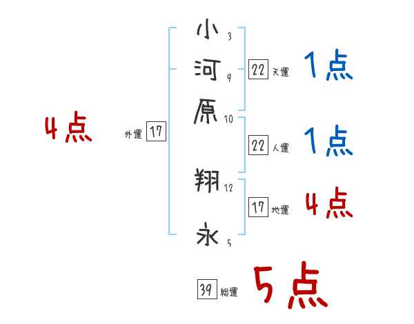外運![]() | 小河原翔永さんの外運は17画の4つ星!積極的な行動力。地位を気づき財産を手に入れる。純粋な心と直感力。 生活面を象徴する運勢です。外部から受ける影響力を表し、結婚運、家庭運や職場、環境への順応性を表します。 |