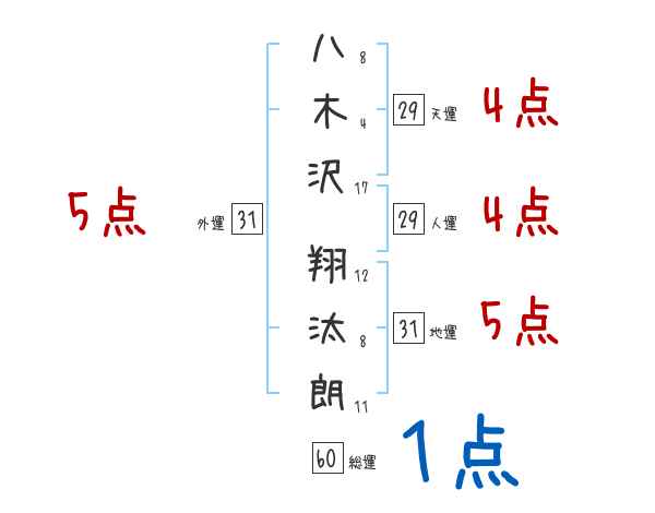 外運![]() | 八木沢翔汰朗さんの外運は31画の5つ星!社交性があり判断力に優れる。順風満帆な人生で円満な生活。 生活面を象徴する運勢です。外部から受ける影響力を表し、結婚運、家庭運や職場、環境への順応性を表します。 |