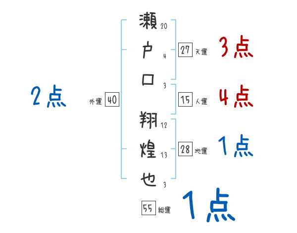 外運![]() | 瀬戸口翔煌也さんの外運は40画の2つ星!自信過剰で物事に固執するためトラブルに注意。 生活面を象徴する運勢です。外部から受ける影響力を表し、結婚運、家庭運や職場、環境への順応性を表します。 |