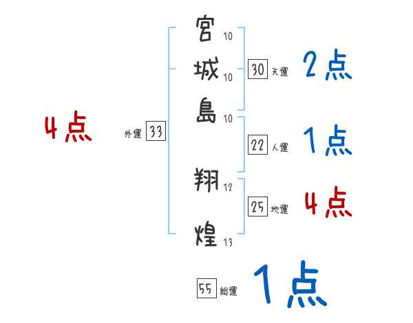 天運![]() | 宮城島翔煌さんの天運は30画の2つ星!浮き沈みの激しさに注意しましょう。 家系が持つ宿命的な運勢を表します。祖先から受け継いだ苗字ですので自分の力が及びません。家柄を象徴します。 |