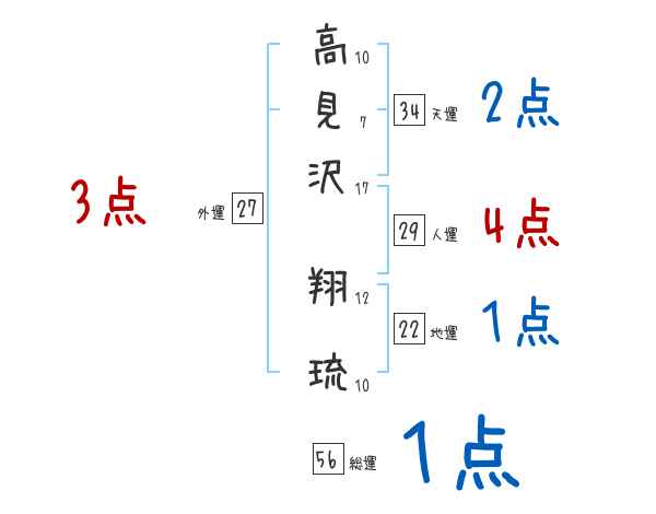 人運![]() | 高見沢翔琉さんの人運は29画の4つ星!完全主義で才能がある。厳格な心の持ち主。 性格や才能などを表す2番目に重要な運勢です。人間関係や協調性、社会的な成功に影響します。主に20歳から50歳ぐらいまでの中年期の運勢を表します。 |