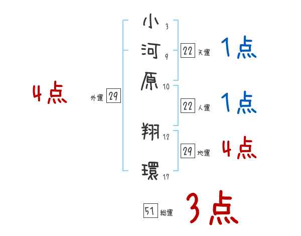 外運![]() | 小河原翔環さんの外運は29画の4つ星!完全主義で才能がある。厳格な心の持ち主。 生活面を象徴する運勢です。外部から受ける影響力を表し、結婚運、家庭運や職場、環境への順応性を表します。 |