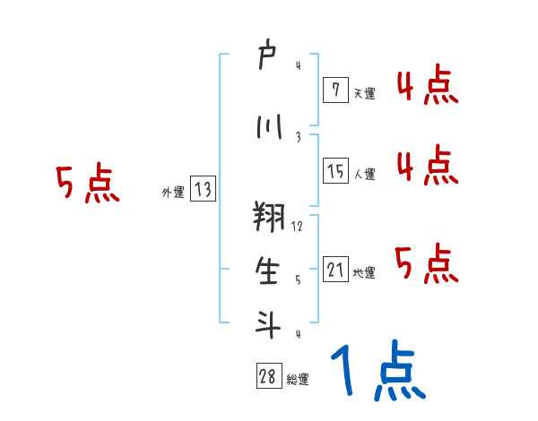 天運![]() | 戸川翔生斗さんの天運は7画の4つ星!強い意志や信念を持ち独立心が強い。自立する。 家系が持つ宿命的な運勢を表します。祖先から受け継いだ苗字ですので自分の力が及びません。家柄を象徴します。 |