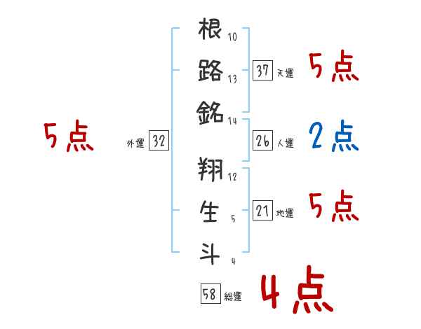 外運![]() | 根路銘翔生斗さんの外運は32画の5つ星!柔軟性があり成功する。チャンスが多く金運が良い。 生活面を象徴する運勢です。外部から受ける影響力を表し、結婚運、家庭運や職場、環境への順応性を表します。 |