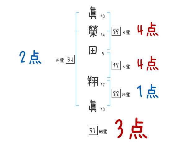 天運![]() | 眞榮田翔眞さんの天運は29画の4つ星!完全主義で才能がある。厳格な心の持ち主。 家系が持つ宿命的な運勢を表します。祖先から受け継いだ苗字ですので自分の力が及びません。家柄を象徴します。 |