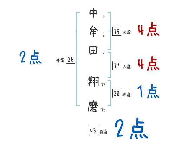 天運![]() | 中牟田翔磨さんの天運は15画の4つ星!人徳があり出世する。順調に物事を進め円満な人生。 家系が持つ宿命的な運勢を表します。祖先から受け継いだ苗字ですので自分の力が及びません。家柄を象徴します。 |