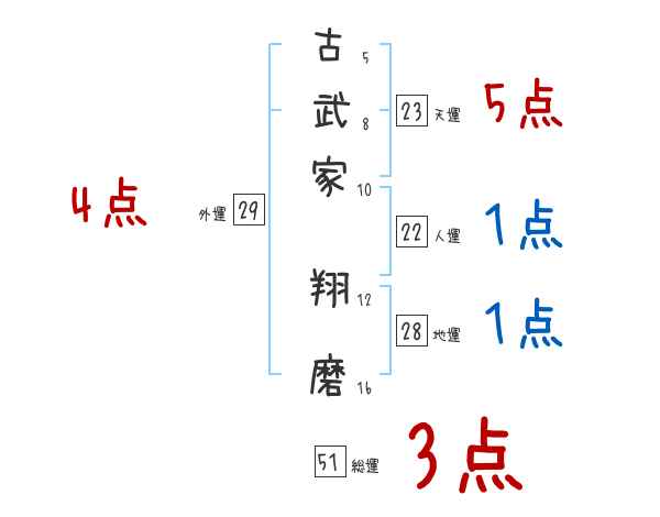 天運![]() | 古武家翔磨さんの天運は23画の5つ星!想像力に優れ活力がある。一代で成功し名誉を手に入れる。 家系が持つ宿命的な運勢を表します。祖先から受け継いだ苗字ですので自分の力が及びません。家柄を象徴します。 |
