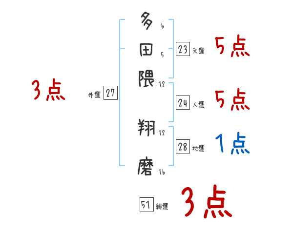 天運![]() | 多田隈翔磨さんの天運は23画の5つ星!想像力に優れ活力がある。一代で成功し名誉を手に入れる。 家系が持つ宿命的な運勢を表します。祖先から受け継いだ苗字ですので自分の力が及びません。家柄を象徴します。 |
