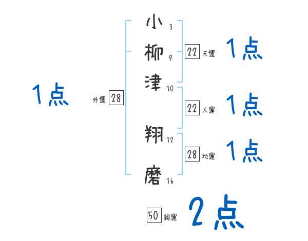 人運![]() | 小柳津翔磨さんの人運は22画の1つ星!努力することが苦手ないっぽう手先が器用。芸術性にも優れる。 性格や才能などを表す2番目に重要な運勢です。人間関係や協調性、社会的な成功に影響します。主に20歳から50歳ぐらいまでの中年期の運勢を表します。 |