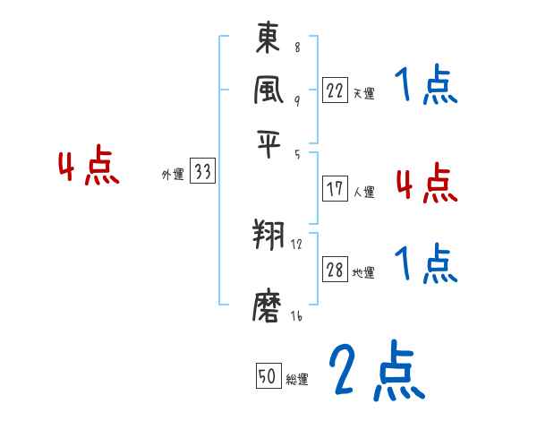 外運![]() | 東風平翔磨さんの外運は33画の4つ星!権力志向でプライドが高い。勇気があり運を切り開き成功する。 生活面を象徴する運勢です。外部から受ける影響力を表し、結婚運、家庭運や職場、環境への順応性を表します。 |