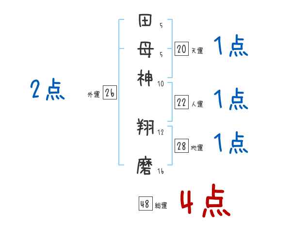 外運![]() | 田母神翔磨さんの外運は26画の2つ星!波瀾万丈かも。信頼できる人を大事にしましょう。 生活面を象徴する運勢です。外部から受ける影響力を表し、結婚運、家庭運や職場、環境への順応性を表します。 |