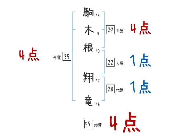 総運![]() | 駒木根翔竜さんの総運は57画の4つ星!向上心があり人望がある。地位を得る。 あなたの人生を表す1番重要な運勢です。生涯を通じて影響する総合運となり、主に50歳以降の晩年期に影響を及ぼします。 |