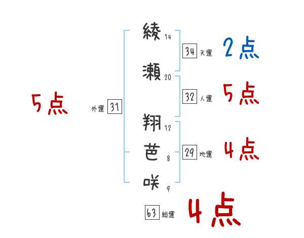 人運![]() | 綾瀬翔芭咲さんの人運は32画の5つ星!柔軟性があり成功する。チャンスが多く金運が良い。 性格や才能などを表す2番目に重要な運勢です。人間関係や協調性、社会的な成功に影響します。主に20歳から50歳ぐらいまでの中年期の運勢を表します。 |