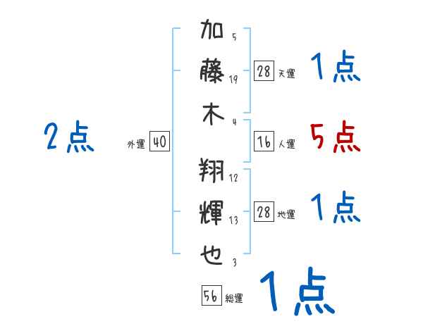 天運![]() | 加藤木翔輝也さんの天運は28画の1つ星!家庭環境に注意。スポーツで活躍できる能力があるかも。 家系が持つ宿命的な運勢を表します。祖先から受け継いだ苗字ですので自分の力が及びません。家柄を象徴します。 |