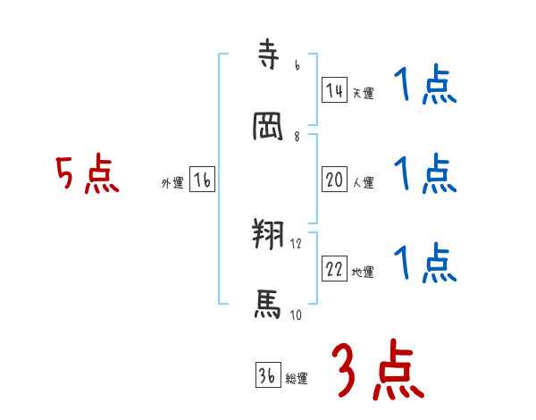 総運![]() | 寺岡翔馬さんの総運は36画の3つ星!先見性が豊かです。多少神経質で苦労することも。 あなたの人生を表す1番重要な運勢です。生涯を通じて影響する総合運となり、主に50歳以降の晩年期に影響を及ぼします。 |