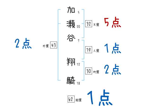 天運![]() | 加瀬谷翔騎さんの天運は32画の5つ星!柔軟性があり成功する。チャンスが多く金運が良い。 家系が持つ宿命的な運勢を表します。祖先から受け継いだ苗字ですので自分の力が及びません。家柄を象徴します。 |
