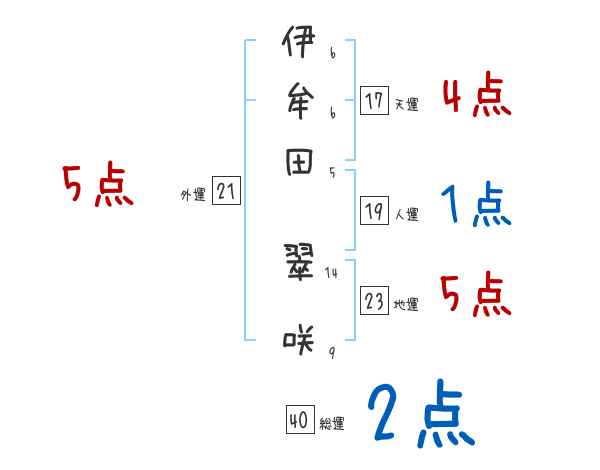 外運![]() | 伊牟田翠咲さんの外運は21画の5つ星!統率力がある。独立し成功する。名誉を手に入れる。 生活面を象徴する運勢です。外部から受ける影響力を表し、結婚運、家庭運や職場、環境への順応性を表します。 |