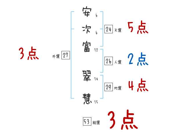 天運![]() | 安次富翠慧さんの天運は24画の5つ星!家庭運が良く順調な人生。金運にも恵まれる。 家系が持つ宿命的な運勢を表します。祖先から受け継いだ苗字ですので自分の力が及びません。家柄を象徴します。 |
