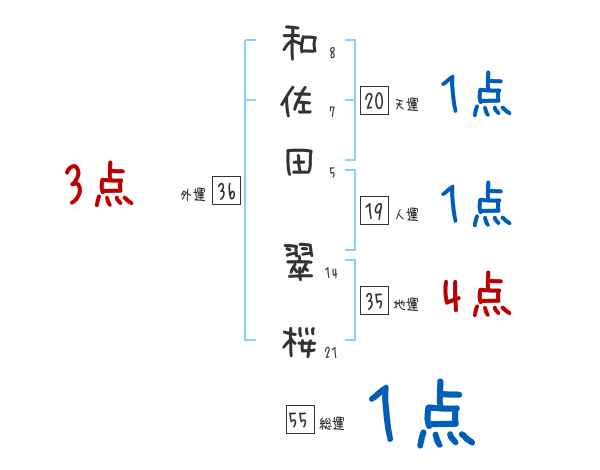 外運![]() | 和佐田翠桜さんの外運は36画の3つ星!先見性が豊かです。多少神経質で苦労することも。 生活面を象徴する運勢です。外部から受ける影響力を表し、結婚運、家庭運や職場、環境への順応性を表します。 |