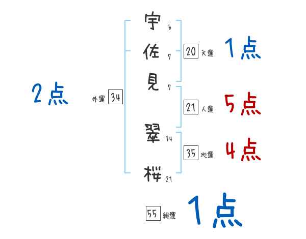 人運![]() | 宇佐見翠桜さんの人運は21画の5つ星!統率力がある。独立し成功する。名誉を手に入れる。 性格や才能などを表す2番目に重要な運勢です。人間関係や協調性、社会的な成功に影響します。主に20歳から50歳ぐらいまでの中年期の運勢を表します。 |