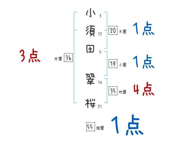 外運![]() | 小須田翠桜さんの外運は36画の3つ星!先見性が豊かです。多少神経質で苦労することも。 生活面を象徴する運勢です。外部から受ける影響力を表し、結婚運、家庭運や職場、環境への順応性を表します。 |