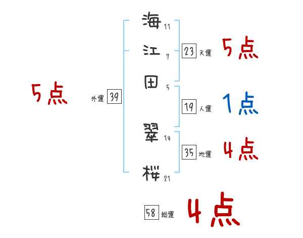 外運![]() | 海江田翠桜さんの外運は39画の5つ星!社交性に優れ人望が厚い。人の上に立ち成功する。 生活面を象徴する運勢です。外部から受ける影響力を表し、結婚運、家庭運や職場、環境への順応性を表します。 |