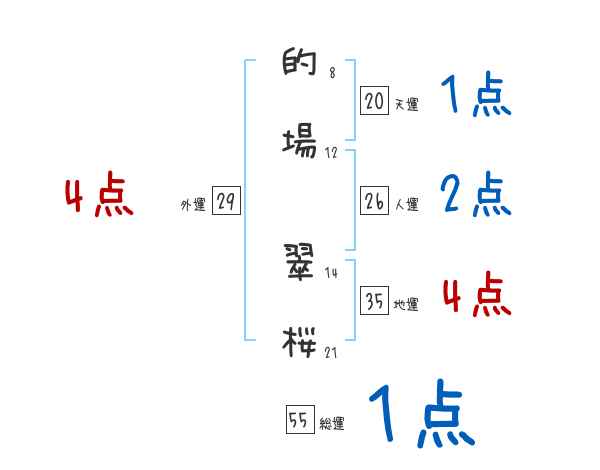 外運![]() | 的場翠桜さんの外運は29画の4つ星!完全主義で才能がある。厳格な心の持ち主。 生活面を象徴する運勢です。外部から受ける影響力を表し、結婚運、家庭運や職場、環境への順応性を表します。 |