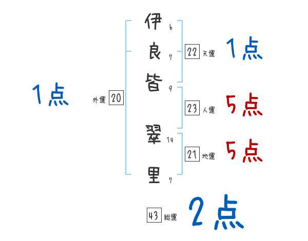 人運![]() | 伊良皆翠里さんの人運は23画の5つ星!想像力に優れ活力がある。一代で成功し名誉を手に入れる。 性格や才能などを表す2番目に重要な運勢です。人間関係や協調性、社会的な成功に影響します。主に20歳から50歳ぐらいまでの中年期の運勢を表します。 |