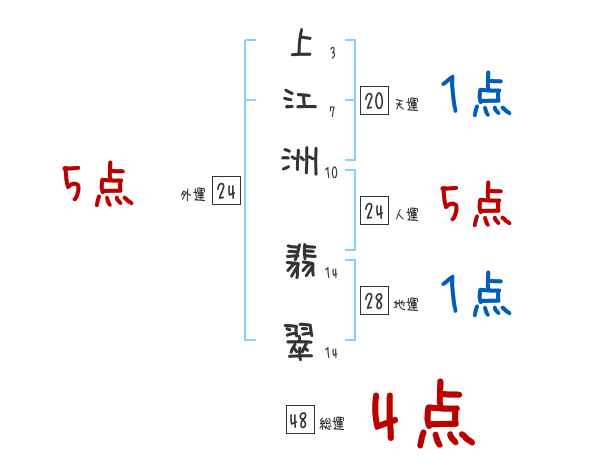 外運![]() | 上江洲翡翠さんの外運は24画の5つ星!家庭運が良く順調な人生。金運にも恵まれる。 生活面を象徴する運勢です。外部から受ける影響力を表し、結婚運、家庭運や職場、環境への順応性を表します。 |
