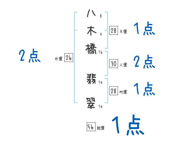 外運![]() | 八木橋翡翠さんの外運は26画の2つ星!波瀾万丈かも。信頼できる人を大事にしましょう。 生活面を象徴する運勢です。外部から受ける影響力を表し、結婚運、家庭運や職場、環境への順応性を表します。 |