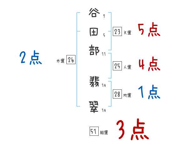 天運![]() | 谷田部翡翠さんの天運は23画の5つ星!想像力に優れ活力がある。一代で成功し名誉を手に入れる。 家系が持つ宿命的な運勢を表します。祖先から受け継いだ苗字ですので自分の力が及びません。家柄を象徴します。 |