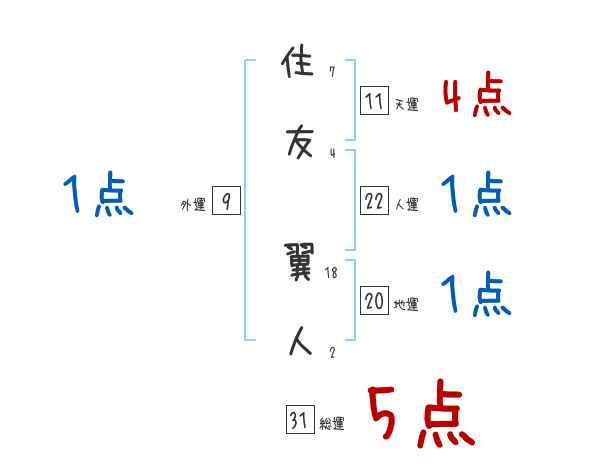 天運![]() | 住友翼人さんの天運は11画の4つ星!着実に富や地位を得る幸運な人生。 家系が持つ宿命的な運勢を表します。祖先から受け継いだ苗字ですので自分の力が及びません。家柄を象徴します。 |