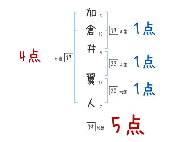 外運![]() | 加倉井翼人さんの外運は17画の4つ星!積極的な行動力。地位を気づき財産を手に入れる。純粋な心と直感力。 生活面を象徴する運勢です。外部から受ける影響力を表し、結婚運、家庭運や職場、環境への順応性を表します。 |