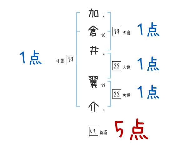 外運![]() | 加倉井翼介さんの外運は19画の1つ星!優れた才能を持ちますが、協調性が足りないことも。周りの人と協力する事を意識しましょう。 生活面を象徴する運勢です。外部から受ける影響力を表し、結婚運、家庭運や職場、環境への順応性を表します。 |