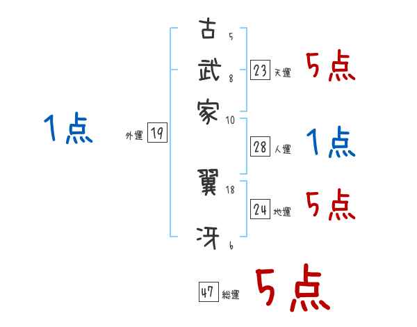 天運![]() | 古武家翼冴さんの天運は23画の5つ星!想像力に優れ活力がある。一代で成功し名誉を手に入れる。 家系が持つ宿命的な運勢を表します。祖先から受け継いだ苗字ですので自分の力が及びません。家柄を象徴します。 |