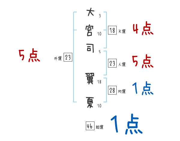 人運![]() | 大宮司翼夏さんの人運は23画の5つ星!想像力に優れ活力がある。一代で成功し名誉を手に入れる。 性格や才能などを表す2番目に重要な運勢です。人間関係や協調性、社会的な成功に影響します。主に20歳から50歳ぐらいまでの中年期の運勢を表します。 |