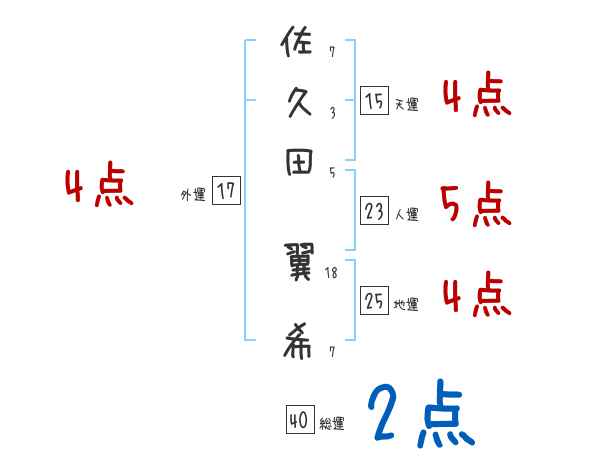 外運![]() | 佐久田翼希さんの外運は17画の4つ星!積極的な行動力。地位を気づき財産を手に入れる。純粋な心と直感力。 生活面を象徴する運勢です。外部から受ける影響力を表し、結婚運、家庭運や職場、環境への順応性を表します。 |