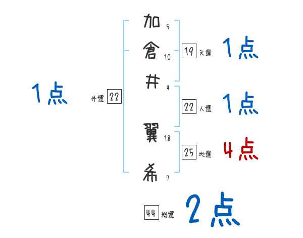 総運![]() | 加倉井翼希さんの総運は44画の2つ星!誠実で慎重な性格。物事を考えすぎないように注意しましょう。 あなたの人生を表す1番重要な運勢です。生涯を通じて影響する総合運となり、主に50歳以降の晩年期に影響を及ぼします。 |