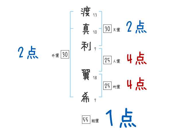 天運![]() | 渡真利翼希さんの天運は30画の2つ星!浮き沈みの激しさに注意しましょう。 家系が持つ宿命的な運勢を表します。祖先から受け継いだ苗字ですので自分の力が及びません。家柄を象徴します。 |
