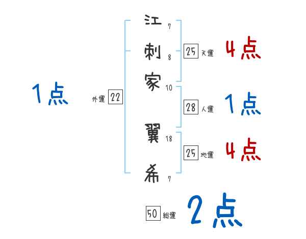 天運![]() | 江刺家翼希さんの天運は25画の4つ星!個性があり才能があふれる。強運の持ち主で発展する。 家系が持つ宿命的な運勢を表します。祖先から受け継いだ苗字ですので自分の力が及びません。家柄を象徴します。 |