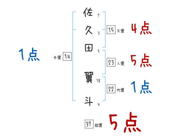 人運![]() | 佐久田翼斗さんの人運は23画の5つ星!想像力に優れ活力がある。一代で成功し名誉を手に入れる。 性格や才能などを表す2番目に重要な運勢です。人間関係や協調性、社会的な成功に影響します。主に20歳から50歳ぐらいまでの中年期の運勢を表します。 |