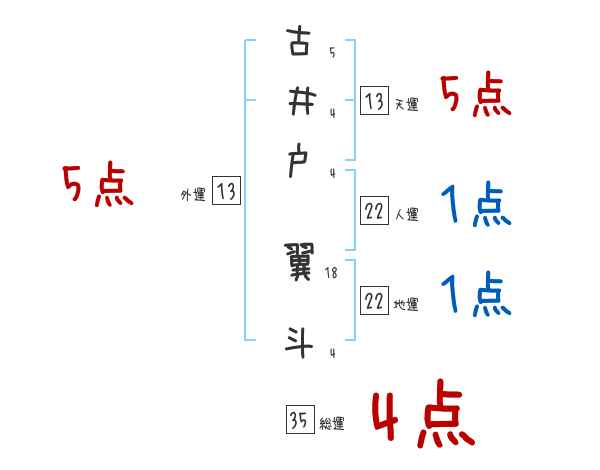 天運![]() | 古井戸翼斗さんの天運は13画の5つ星!才能に恵まれ人気がある。名声を手に入れる。円満な人生。 家系が持つ宿命的な運勢を表します。祖先から受け継いだ苗字ですので自分の力が及びません。家柄を象徴します。 |