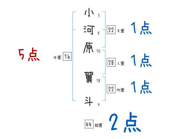 外運![]() | 小河原翼斗さんの外運は16画の5つ星!人望が厚く大きく発展する。逆転成功が見える。 生活面を象徴する運勢です。外部から受ける影響力を表し、結婚運、家庭運や職場、環境への順応性を表します。 |