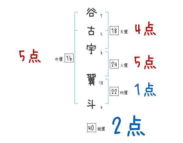 外運![]() | 谷古宇翼斗さんの外運は16画の5つ星!人望が厚く大きく発展する。逆転成功が見える。 生活面を象徴する運勢です。外部から受ける影響力を表し、結婚運、家庭運や職場、環境への順応性を表します。 |
