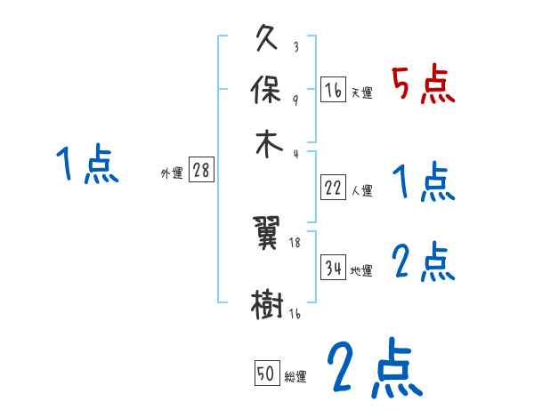 人運![]() | 久保木翼樹さんの人運は22画の1つ星!努力することが苦手ないっぽう手先が器用。芸術性にも優れる。 性格や才能などを表す2番目に重要な運勢です。人間関係や協調性、社会的な成功に影響します。主に20歳から50歳ぐらいまでの中年期の運勢を表します。 |