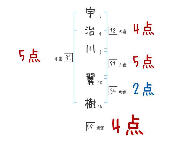 天運![]() | 宇治川翼樹さんの天運は18画の4つ星!情熱的で剛気。忍耐力があり信頼される。 家系が持つ宿命的な運勢を表します。祖先から受け継いだ苗字ですので自分の力が及びません。家柄を象徴します。 |