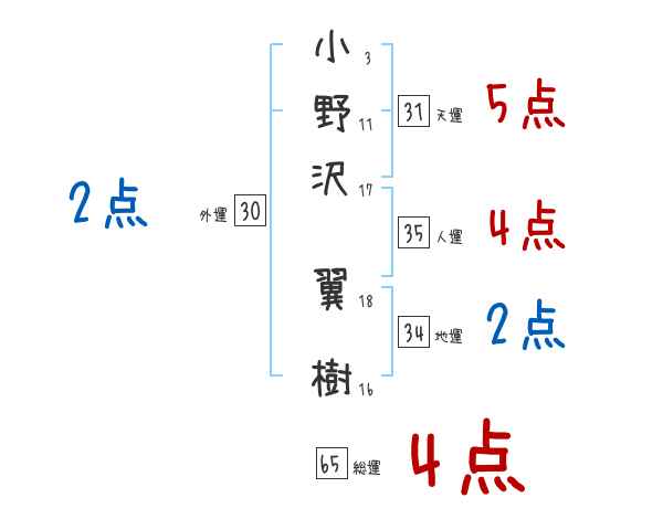 総運![]() | 小野沢翼樹さんの総運は65画の4つ星!幸運に恵まれ繁栄する。包容力がある。 あなたの人生を表す1番重要な運勢です。生涯を通じて影響する総合運となり、主に50歳以降の晩年期に影響を及ぼします。 |