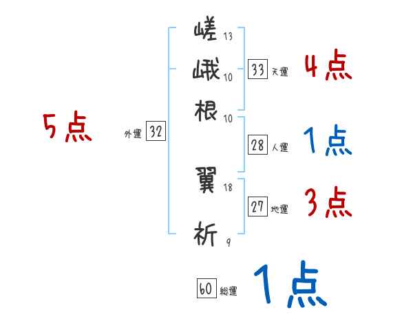 外運![]() | 嵯峨根翼祈さんの外運は32画の5つ星!柔軟性があり成功する。チャンスが多く金運が良い。 生活面を象徴する運勢です。外部から受ける影響力を表し、結婚運、家庭運や職場、環境への順応性を表します。 |